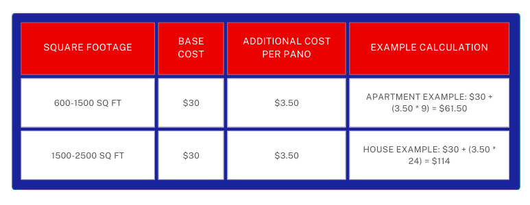 Our pricing is straightforward and honest. Each Virtual Tour starts at a base price of $30 dollars, covering our operating expenses as well as the time to build the tour, plus $3.50 for each panorama. Our pricing is subject to change.